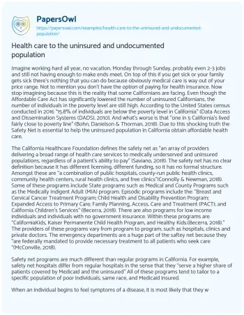 Health care to the uninsured and undocumented population. (2021, Oct 16). Retrieved from https://hub.papersowl.com/examples/health-care-to-the-uninsured-and-undocumented-population/