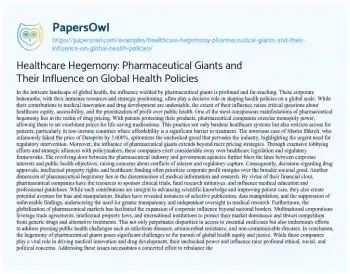 This essay about the pervasive influence of pharmaceutical giants in global health underscores their significant impact on drug pricing, healthcare legislation, and medical research. The unchecked power of these corporate behemoths, exemplified by exorbitant drug prices and lobbying efforts, raises critical questions about equity and accessibility in healthcare. The intertwining of corporate interests with government agencies further blurs ethical boundaries, emphasizing the urgent need for regulatory intervention. Additionally, the essay explores the global dimension of pharmaceutical hegemony, highlighting how multinational corporations hinder access to essential medicines and impede efforts to address public health challenges. The conclusion calls for collective action and systemic reform to prioritize public health over corporate interests and achieve global health equity.