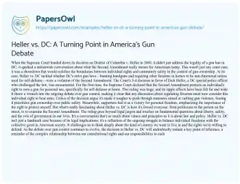 This essay about the Supreme Court case District of Columbia v. Heller discusses its impact on the interpretation of the Second Amendment and the broader national debate over gun control. The 2008 decision, which struck down DC’s handgun ban and recognized an individual’s right to own firearms for personal use, particularly for self-defense in the home, marked a significant shift in how gun rights are viewed in America. By siding with Heller, the Supreme Court ignited discussions on the balance between individual rights and public safety, influencing both supporters and critics of gun control. The essay explores the ramifications of this landmark ruling, emphasizing its role in redefining the conversation around gun ownership, personal freedom, and governmental regulation. Heller vs. DC is portrayed not just as a legal milestone but as a pivotal moment in the ongoing dialogue about the values and principles that shape American society.