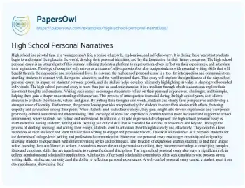 High School Personal Narratives. (2025, Mar 30). Retrieved from https://hub.papersowl.com/examples/high-school-personal-narratives/