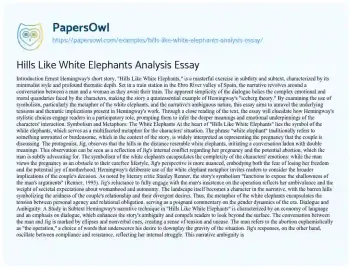 " By examining the use of symbolism, particularly the metaphor of the white elephants, and the narrative's ambiguous nature, this essay aims to unravel the underlying tensions and thematic implications present in Hemingway's work. Through a close reading of the text, the essay will elucidate how Hemingway's stylistic choices engage readers in a participatory role, prompting them to infer the deeper meanings and emotional underpinnings of the characters' interaction.