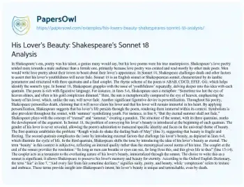 His Lover’s Beauty: Shakespeare’s Sonnet 18 Analysis. (2021, Mar 25). Retrieved from https://hub.papersowl.com/examples/his-lovers-beauty-shakespeares-sonnet-18-analysis/