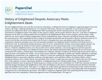 This essay examines the intriguing concept of ‘enlightened despots,’ a term that refers to 18th-century European monarchs who combined the progressive ideals of the Enlightenment with autocratic rule. It delves into the characteristics and actions of these rulers, such as Frederick the Great of Prussia, Catherine the Great of Russia, and Joseph II of Austria, highlighting their efforts in reforming their states in areas like administration, justice, education, and religious tolerance. The essay critically evaluates the paradox of their rule: while they introduced significant reforms that mirrored Enlightenment values, they maintained absolute control, limiting the scope and endurance of their changes. It discusses the contradiction inherent in their desire to modernize and rationalize their states while suppressing democratic principles and retaining autocratic power. The essay concludes by reflecting on the complex legacy of enlightened despotism, acknowledging its role in laying the groundwork for modernization in Europe but also recognizing its inherent limitations and contradictions, offering insight into the multifaceted nature of political power and reform. Also at PapersOwl you can find more free essay examples related to History