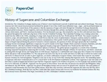 This essay will explore the history of sugarcane and its role in the Columbian Exchange. It will detail sugarcane’s origins, its introduction to the New World, and how its cultivation dramatically impacted global trade, economies, and societies. The essay will discuss the development of sugar plantations, the resultant rise in the slave trade, and the environmental impacts. It will also examine sugarcane’s influence on cultural and culinary practices across the world, framing it within the broader context of the Columbian Exchange’s effects on global history. Moreover, at PapersOwl, there are additional free essay samples connected to Atlantic Slave Trade.