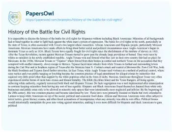 It is impossible to discuss the history of the battle for civil rights for Hispanics without including Black Americans. Minorites of all backgrounds had to band together in order to fight back against the white man’s system of oppression. The battle for civil rights in the south, particularly in the state of Texas, is often associated with Texas's two largest ethnic minorities: African Americans and Hispanic people, particularly Mexican Americans. Mexican Americans have made efforts to bring about better social and political circumstances since Anglo-American’s began to dominate Texas as early as 1836.