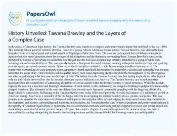 This essay delves into the intricate and controversial Tawana Brawley case, a significant chapter in American legal history during the late 1980s. Tawana Brawley, an African American woman, claimed to be a victim of a brutal racial and sexual assault, sparking national debates and protests against perceived systemic racism. However, as the investigation progressed, inconsistencies in Brawley’s narrative emerged, leading a grand jury to conclude that she had fabricated the entire story. The fallout from the case resulted in public skepticism about the investigation’s thoroughness and raised questions about trust. This episode not only left lasting implications for those involved but also contributed to the broader discourse on race and justice in America. Examining the Tawana Brawley case today provides an opportunity to revisit the complexities of a tumultuous period, emphasizing the need for balanced investigations in addressing allegations within the intricate dynamics of race, gender, and justice. More free essay examples are accessible at PapersOwl about History.