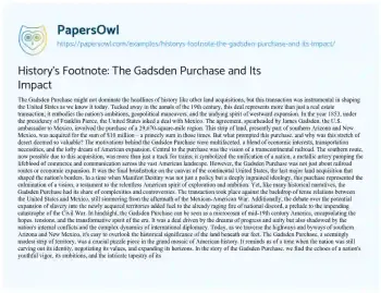 This essay explores the historical significance of the Gadsden Purchase, a nuanced chapter in America’s expansion narrative. It delves into the acquisition of a vast stretch of land from Mexico in 1853, a move driven by the ambition to construct a transcontinental railroad and fulfill the Manifest Destiny ideology. The piece highlights the multifaceted motivations behind the purchase, including economic interests and the desire to unify the nation through transportation. It also touches on the complexities and controversies surrounding the deal, set against the backdrop of tense U.S.-Mexico relations and the heated debate over slavery expansion. The essay encapsulates the Gadsden Purchase as a microcosm of mid-19th century America, reflecting the era’s hopes, tensions, and transformative spirit, and underscores its lasting impact as a crucial piece in the mosaic of American history. Also at PapersOwl you can find more free essay examples related to History.