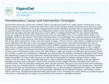Homelessness Causes and Intervention Strategies. (2023, Jun 21). Retrieved from https://hub.papersowl.com/examples/homelessness-social-problem-understanding-the-causes-and-challenges/