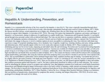 Hepatitis A: Understanding, Prevention, and Homeostasis. (2019, Jan 30). Retrieved from https://hub.papersowl.com/examples/homeostasis-is-a-communicable-infection/