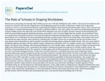 The Role of Schools in Shaping Worldviews. (2019, Dec 26). Retrieved from https://hub.papersowl.com/examples/homeschooling-in-america/