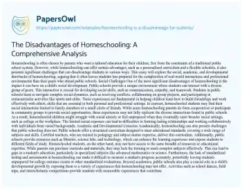 The Disadvantages of Homeschooling: A Comprehensive Analysis. (2020, Jan 31). Retrieved from https://hub.papersowl.com/examples/homeschooling-is-a-disadvantage-for-sudents/