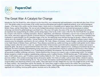 The Great War: A Catalyst for Change. (2020, Apr 26). Retrieved from https://hub.papersowl.com/examples/horror-of-world-war-i/