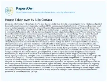 This essay will provide an analysis of Julio Cortázar’s short story “House Taken Over.” It will explore the story’s themes of isolation, fear, and the unknown. The piece will analyze Cortázar’s use of narrative style and symbolism, particularly focusing on the significance of the house and the unseen presence that takes it over. It will also consider the story’s broader political and social implications, particularly in the context of Cortázar’s life and work in Argentina. Also at PapersOwl you can find more free essay examples related to Gothic Fiction.
