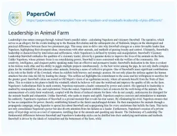 This essay will compare Snowball and Napoleon, two central characters in George Orwell’s “Animal Farm,” as leaders. It will analyze their leadership styles, ideologies, and methods, discussing how each character’s approach affects the farm and its inhabitants. The piece will explore themes of power, corruption, and idealism in the context of Orwell’s allegorical representation of Soviet Russia. At PapersOwl too, you can discover numerous free essay illustrations related to Animal Farm.