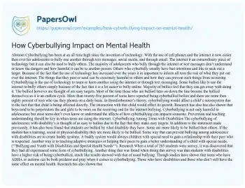 This essay will examine the impact of cyberbullying on mental health. It will discuss the psychological effects such as depression, anxiety, and lowered self-esteem experienced by victims of cyberbullying. The piece will explore prevention strategies and support mechanisms to mitigate these impacts. Also at PapersOwl you can find more free essay examples related to Adolescence.