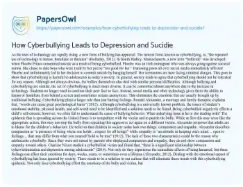 Examine the link between cyberbullying, depression, and suicide among adolescents. Discuss how online harassment exacerbates mental health issues, the impact of social media, and the need for preventive measures and support systems. Highlight real-life cases and psychological studies to illustrate these effects. More free essay examples are accessible at PapersOwl about Cyber Bullying.