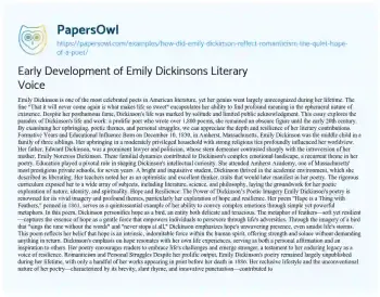 Early Development of Emily Dickinsons Literary Voice. (2023, Aug 20). Retrieved from https://hub.papersowl.com/examples/how-did-emily-dickinson-reflect-romanticism-the-quiet-hope-of-a-poet/