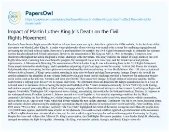 Impact of Martin Luther King Jr.'s Death on the Civil Rights Movement. (2020, Mar 26). Retrieved from https://hub.papersowl.com/examples/how-did-martin-luther-kings-jr-death-affect-the-civil-rights-movement/