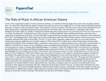 The Role of Music in African American Slavery. (2019, Jul 22). Retrieved from https://hub.papersowl.com/examples/how-did-music-enhance-the-experience-of-slavery/