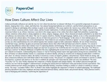 Culture profoundly influences not only the way we view others but also how we interact with them. It is a powerful component of a person’s identity, shaping their views, values, and behaviors. Our cultural background informs our worldview, and the beliefs and practices we are exposed to during our upbringing often continue to guide us into adulthood. This essay explores the various ways culture affects our lives, with a focus on African American culture, family values, and the broader implications of cultural misunderstandings.