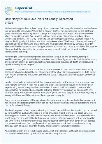 How Many Of You Have Ever Felt Lonely, Depressed, or Sad. (2021, Feb 26). Retrieved from https://hub.papersowl.com/examples/how-many-of-you-have-ever-felt-lonely-depressed-or-sad/