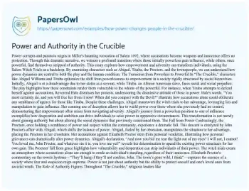 In conclusion, "The Crucible" masterfully portrays the transformative nature of power and its profound impact on individuals and society. Through characters like Abigail, Tituba, and the Proctors, Arthur Miller illustrates how adversity can catalyze empowerment or lead to desperation. The play underscores the idea that power, whether gained or lost, reveals the true nature of individuals and their motivations. It serves as a cautionary tale about the potential for power to corrupt and destroy lives. In both the play and real life, power dynamics shape interactions, revealing the complexities of human nature and the moral challenges posed by authority and ambition. As such, "The Crucible" remains a timeless exploration of the human struggle for empowerment and the ethical dilemmas that accompany it.