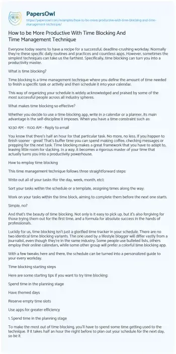 How to be More Productive With Time Blocking And Time Management Technique. (2022, Aug 20). Retrieved from https://hub.papersowl.com/examples/how-to-be-more-productive-with-time-blocking-and-time-management-technique/