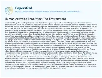This essay will explore how various human activities contribute to climate change. It will discuss the effects of carbon emissions, deforestation, and industrial processes on the environment, and the scientific evidence linking these activities to global warming and ecological disruption. Additionally, PapersOwl presents more free essays samples linked to Climate Change.