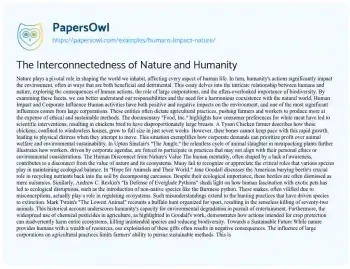 The Interconnectedness of Nature and Humanity. (2020, Feb 15). Retrieved from https://hub.papersowl.com/examples/humans-impact-nature/