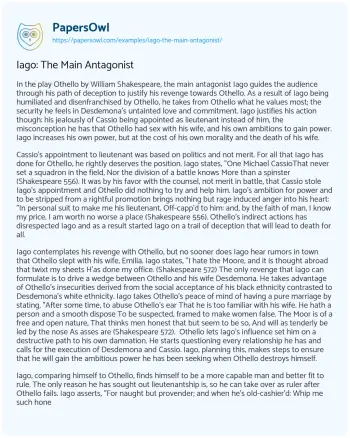 Iago: The Main Antagonist. (2020, Apr 28). Retrieved from https://hub.papersowl.com/examples/iago-the-main-antagonist/