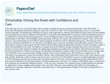 This essay delves into the world of IDriveSafely, an online platform revolutionizing driver education. Titled “IDriveSafely: Navigating the Roads with Confidence and Care,” the piece explores how this innovative platform combines convenience and comprehensive learning to make our roads safer. It highlights IDriveSafely’s commitment to quality, user-friendly approach, and its emphasis on defensive driving, preparing drivers for a lifetime of safe driving. The essay underlines the platform’s flexibility, catering to a wide range of drivers, from beginners to experienced ones. Above all, it underscores how IDriveSafely’s human-centric approach, with customer support and expertly crafted material, makes it a beacon of responsible and informed driving. You can also find more related free essay samples at PapersOwl about Driving.