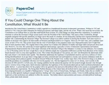 The United States Constitution is widely regarded as a foundational document in democratic governance. Written in 1787 and ratified in 1788, it has provided a blueprint for limited government, individual rights, and the rule of law. While it has stood the test of time, the Constitution is not without flaws or areas that could benefit from revision. If I could change one thing about the Constitution, it would be to eliminate or reform the Electoral College system used to elect the President of the United States.