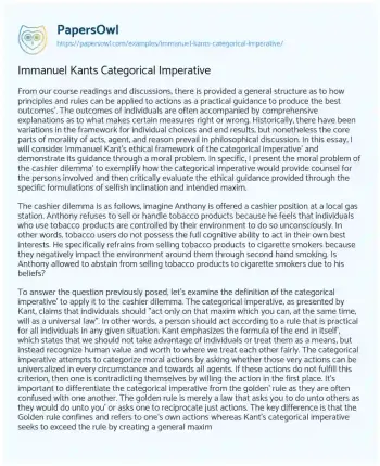 In this essay, I will consider Immanuel Kant's ethical framework of the categorical imperative' and demonstrate its guidance through a moral problem. In specific, I present the moral problem of the cashier dilemma' to exemplify how the categorical imperative would provide counsel for the persons involved and then critically evaluate the ethical guidance provided through the specific formulations of selfish inclination and intended maxim.