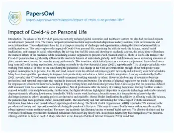 The advent of the Covid-19 pandemic not only reshaped global economies and healthcare systems but also had profound impacts on individuals' personal lives. The virus's rampant spread necessitated unprecedented adaptations in daily routines, work environments, and social interactions. These adjustments have led to a complex interplay of challenges and opportunities, altering the fabric of personal life in multifaceted ways. This essay explores the impact of Covid-19 on personal life, examining the shifts in work-life balance, mental health implications, and changes in social relationships.