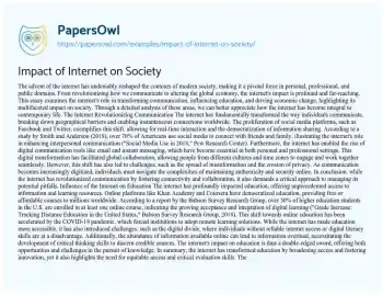 The advent of the internet has undeniably reshaped the contours of modern society, making it a pivotal force in personal, professional, and public domains. From revolutionizing how we communicate to altering the global economy, the internet's impact is profound and far-reaching. This essay examines the internet's role in transforming communication, influencing education, and driving economic change, highlighting its multifaceted impact on society. Through a detailed analysis of these areas, we can better appreciate how the internet has become integral to contemporary life.