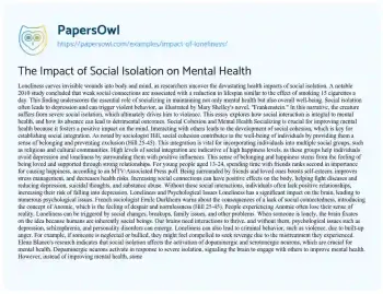 The Impact of Social Isolation on Mental Health. (2019, Mar 10). Retrieved from https://hub.papersowl.com/examples/impact-of-loneliness/