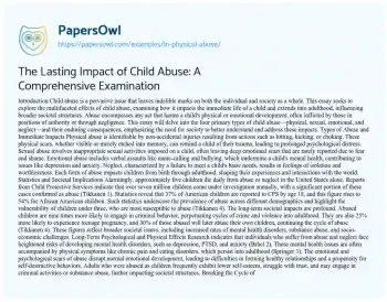 The Lasting Impact of Child Abuse: A Comprehensive Examination. (2019, Nov 18). Retrieved from https://hub.papersowl.com/examples/in-physical-abuse/