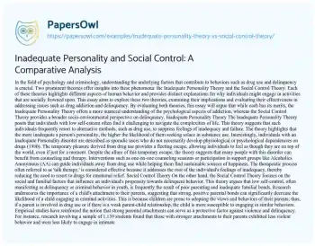 The essay will compare and contrast Inadequate Personality Theory and Social Control Theory, two significant concepts in psychology and criminology. It will explore the origins, main propositions, and applications of each theory, highlighting their differences and similarities. The focus will be on how each theory explains deviant behavior and its implications for understanding and addressing criminal conduct. The piece aims to provide a thorough analysis of these theories to deepen the understanding of behavioral science and criminal psychology. At PapersOwl too, you can discover numerous free essay illustrations related to Personality.