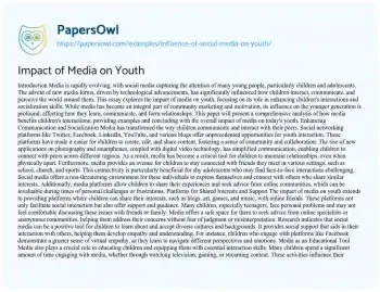 Media is rapidly evolving, with social media capturing the attention of many young people, particularly children and adolescents. The advent of new media forms, driven by technological advancements, has significantly influenced how children interact, communicate, and perceive the world around them. This essay explores the impact of media on youth, focusing on its role in enhancing children's interactions and socialization skills. While media has become an integral part of community marketing and motivation, its influence on the younger generation is profound, affecting how they learn, communicate, and form relationships.