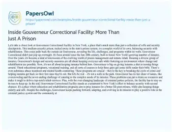 This essay offers an insider’s look at the Gouverneur Correctional Facility in New York, shedding light on the intricacies of its operations beyond just being a medium-security prison. The essay delves into the facility’s history, outlining its evolution since its establishment in the late 20th century and its role within New York’s correctional system. It highlights the facility’s commitment to balancing security with rehabilitation, emphasizing the various educational and vocational programs designed to equip inmates with skills for a successful reintegration into society. The essay also addresses the challenges Gouverneur faces, such as overcrowding and resource strain, and how these impact its ability to effectively rehabilitate inmates. Additionally, it touches on the need for the facility to continually adapt to changing criminal justice policies. Overall, the essay paints a vivid picture of Gouverneur Correctional Facility, portraying it as more than just a place of confinement, but as a dynamic institution striving to positively impact inmates’ lives and contribute to community safety. You can also find more related free essay samples at PapersOwl about Prison.