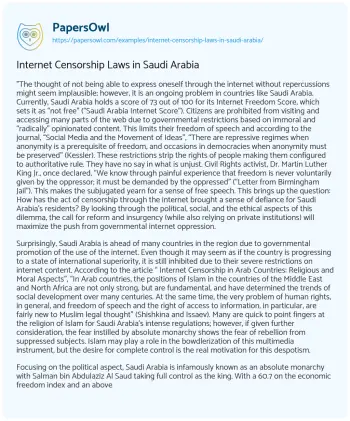 Internet Censorship Laws in Saudi Arabia. (2021, Apr 14). Retrieved from https://hub.papersowl.com/examples/internet-censorship-laws-in-saudi-arabia/