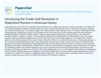 Introducing the Tonkin Gulf Resolution: A Watershed Moment in American History. (2024, Feb 01). Retrieved from https://hub.papersowl.com/examples/introducing-the-tonkin-gulf-resolution-a-watershed-moment-in-american-history/