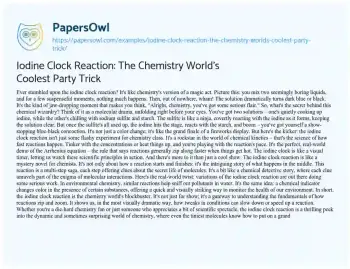 This captivating essay takes you on a journey through the thrilling world of the iodine clock reaction, chemistry’s own magic trick. It paints a vivid picture of this fascinating chemical reaction, where two seemingly mundane solutions come together to create a sudden, dramatic change in color. The essay not only describes this awe-inspiring transformation but also delves into the science behind it. It explains how the reaction serves as a perfect demonstration of chemical kinetics and the Arrhenius equation, showing how reaction rates can be manipulated by changing conditions like concentration and temperature. The piece also highlights the real-world applications of this reaction, particularly in environmental chemistry for pollutant detection. Written in a lively, engaging style, the essay transforms a complex scientific concept into an exciting and understandable narrative. It portrays the iodine clock reaction not just as a classroom experiment, but as a fascinating spectacle that bridges the gap between theoretical chemistry and practical application, captivating both science enthusiasts and the casually curious alike. Additionally, PapersOwl presents more free essays samples linked to Chemistry.