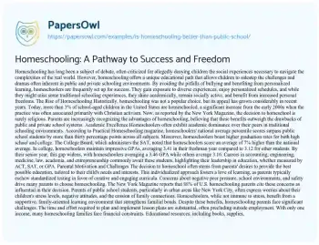 Homeschooling: A Pathway to Success and Freedom. (2020, Jan 17). Retrieved from https://hub.papersowl.com/examples/is-homeschooling-better-than-public-school/