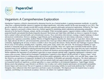 Veganism: A Comprehensive Exploration. (2019, Aug 22). Retrieved from https://hub.papersowl.com/examples/is-veganism-beneficial-or-detrimental-to-society/