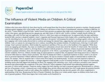 Gerard Jones’s article "Violent Media is Good for Kids" offers an intriguing perspective but falls short of providing a comprehensive and convincing argument. While his personal experiences are compelling, they are not sufficient to substantiate his broader claims. For a more robust analysis, Jones’s argument would benefit from integrating empirical research and addressing potential negative consequences of violent media. Ultimately, the role of violent media in children's lives is complex and requires a nuanced approach that balances potential benefits with cautionary measures. Parents, educators, and policymakers must remain vigilant in guiding children through their media experiences, ensuring that such content serves as a constructive tool rather than a harmful influence.