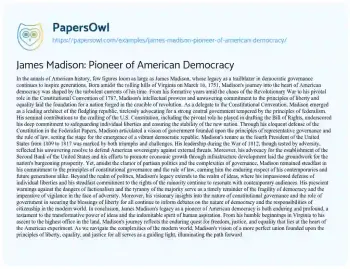 James Madison: Pioneer of American Democracy. (2024, Jun 17). Retrieved from https://hub.papersowl.com/examples/james-madison-pioneer-of-american-democracy/