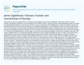 James Oglethorpe: Visionary Founder and Humanitarian of Georgia. (2023, Oct 16). Retrieved from https://hub.papersowl.com/examples/james-oglethorpe-visionary-founder-and-humanitarian-of-georgia/