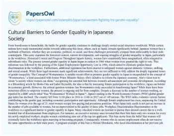 Cultural Barriers to Gender Equality in Japanese Society. (2021, Jun 30). Retrieved from https://hub.papersowl.com/examples/japanese-women-fighting-for-gender-equality/