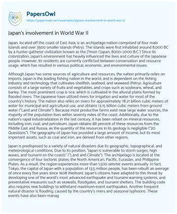 Japan's involvement in World War II. (2022, Apr 29). Retrieved from https://hub.papersowl.com/examples/japans-involvement-in-world-war-ii/